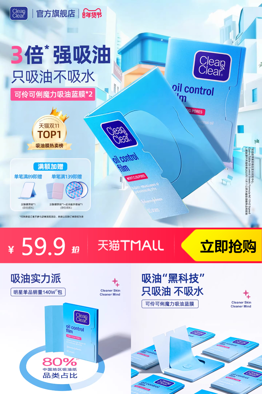 【96.5-立减11.6-券25-淘金币10.42=49.48元,凑消费券到手更低。】可伶可俐魔力吸油蓝膜,吸油实力派,专业去油31年,专业硬实力更安心,吸油蓝粉CP,满足多种出油需求,人性化设计,避免浪费。