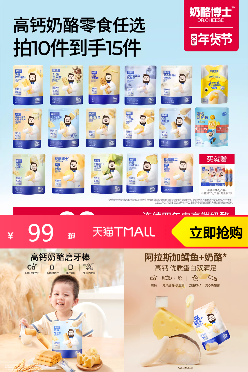 【拍10件 淘金币1.2元+消费券抵扣12.22到手85.57元】奶酪博士宝宝零食:高钙奶酪泡芙、奶贝、奶酪块(蓝莓味)、奶酪块(原味)、小圆奶酪脆(原味)、奶酪夹心海苔脆鳕鱼肠80g、原味奶酪棒、草莓味奶酪棒、高钙奶酪拌饭粉。