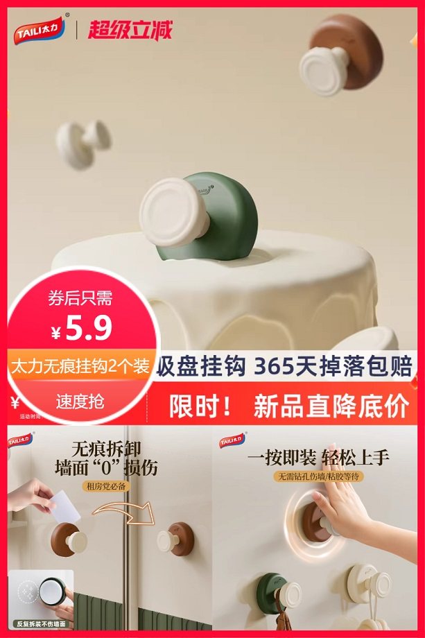 官方立减7元+淘金币抵扣0.38元后约5.52元,品牌大放送,免打孔无粘胶的巨牢不留痕吸盘挂钩,原价12.9/个,现在仅❤5.5/2个❤店内同款销量破万件,防潮防水,挂桶装水都不掉,快来抢购!