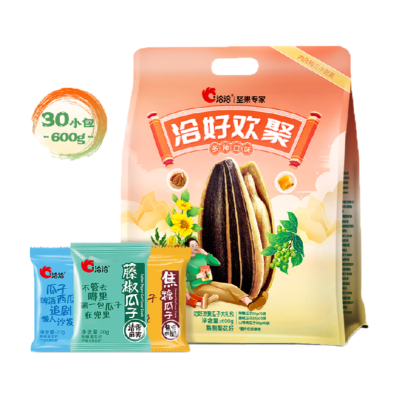 洽洽好欢聚瓜子大礼包,精选多种坚果,焦糖山核桃、藤椒葵花籽、坚果等多种口味,让您享受坚果的乐趣。独立包装,方便携带。