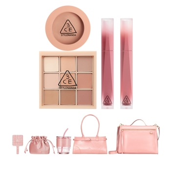 【3CE】9款彩妆单品组合,包含眼影、腮红、唇釉和唇露,满足你的多种彩妆需求。无论是日常妆容还是派对造型,都能轻松驾驭。限时优惠,赶快吧!