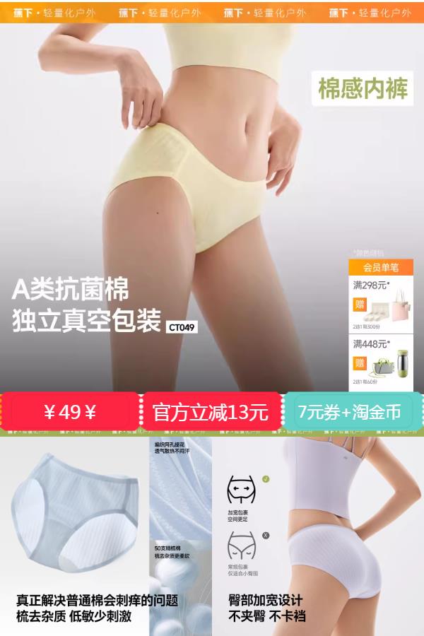 【官方立减13元,领7元优惠券,可抵用淘金币,88VIP叠加消费券,到手约34.8元】A类抗菌棉,独立真空包装,百格棉纱底档,意志厌氧菌,有氧更安心,臀部加宽设计,不夹臀不卡档!