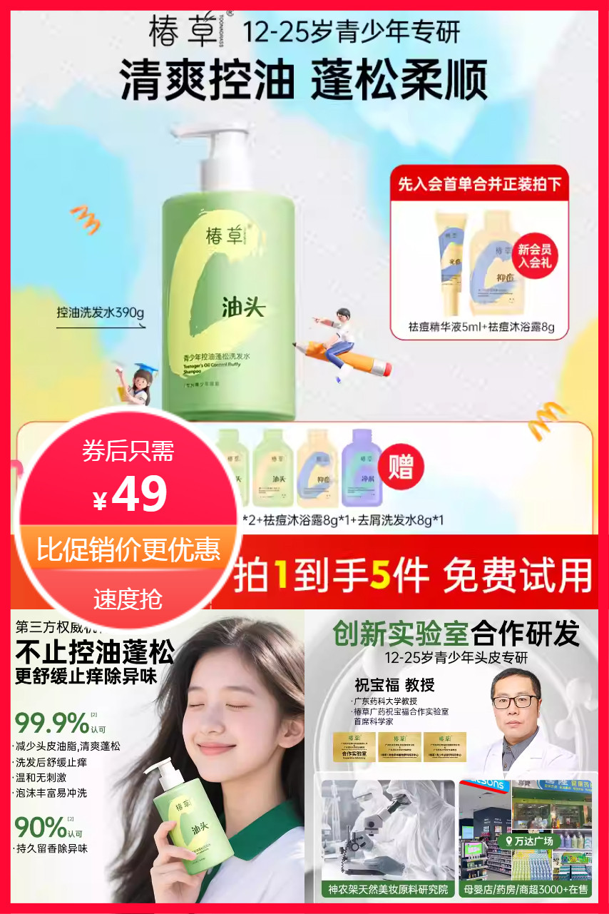 【下拉详情领大额淘金币抵扣9.67元+官方立减9.7元到手约38.9元+去屑洗发水8g+祛痘沐浴露8g+控油洗发水8g】椿草青少年控油洗发水,青少年头皮专研配方,多重氨基酸精华柔顺丝滑,专利酵绩锌+专利积雪草精萃,控油蓬松,去屑止痒,温和无刺激,泡沫丰富冲洗,持久留香除异味,速抢