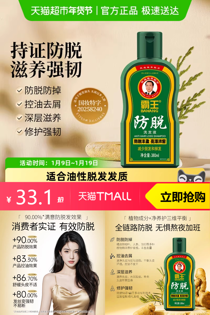 【有淘礼金1.32,淘金币可抵扣1.38,回头客1元券,品牌新客2元券,叠满200-25消费券,88vip到手价22.78】中草药配方,深度滋养毛囊,改善脂溢性脱发,大牌霸王,专柜 正品!育发防脱洗发液,增发密发,植物育发,平衡油脂,乌发固发,养护毛囊!