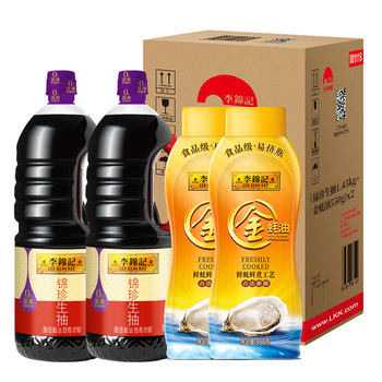 【叠天降1.03,下拉详情页加购,88vip到手19.5/4件,折4.8/件,共4000g,折2.4/500g[庆祝](折消费券到手17/4件)】李锦记,百年品牌,品质保证。这款锦珍生抽和金蚝油的组合箱装,包含1.45kg*2瓶生抽及550g*2瓶蚝油,适合家庭日常烹饪使用。