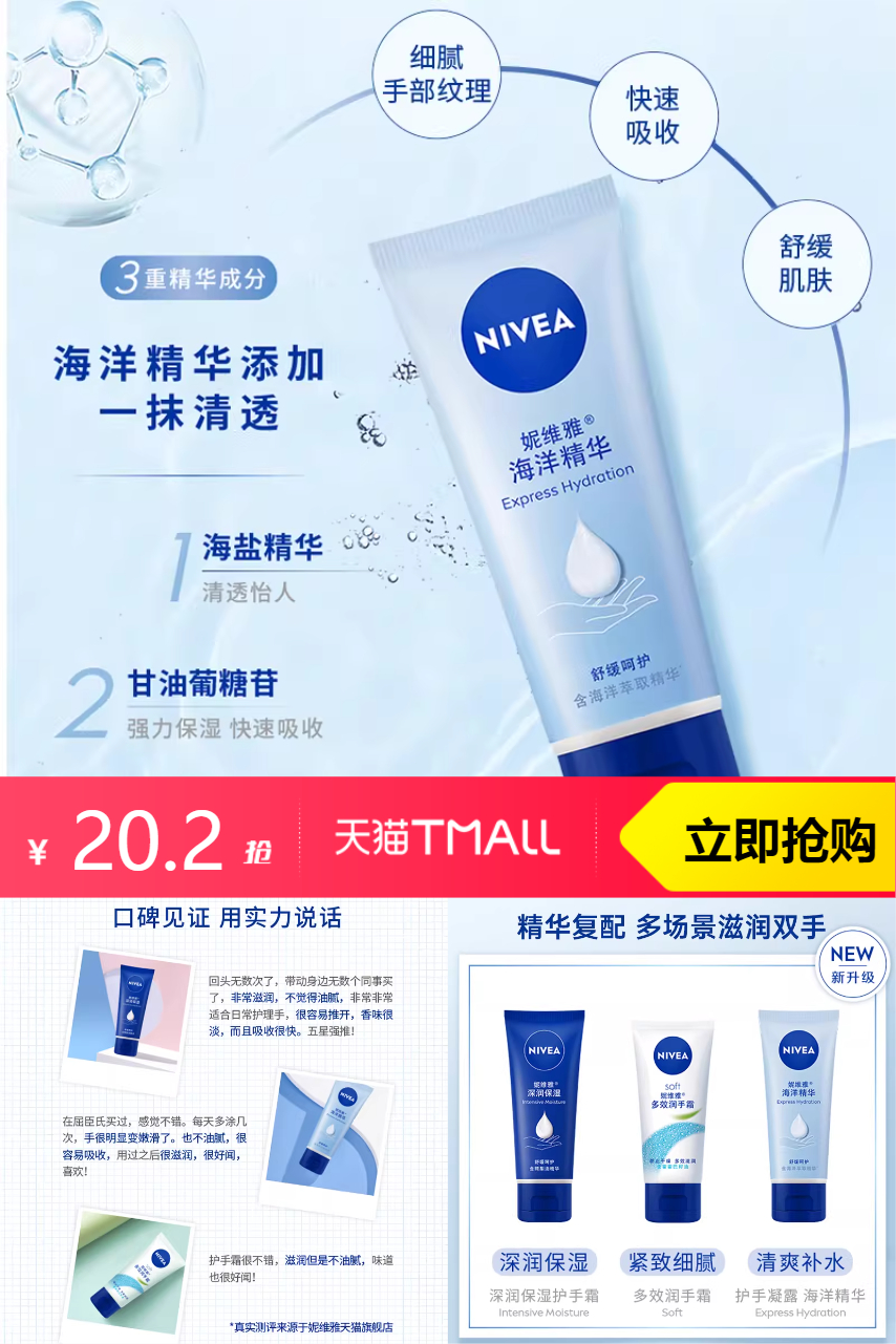 【下拉详情页到秒杀页面,回弹0.5-2元的红包,88vip到手17.9元,折合5元/支】拍3!妮维雅多效护手霜50ml,1抹滋润,呵护双手。