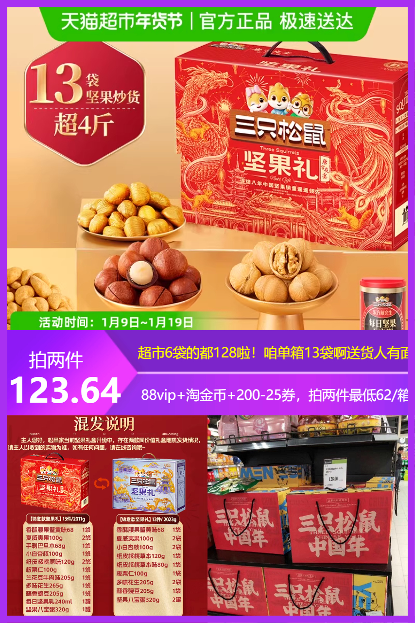 【88vip叠加淘金币抵扣+200-25,拍两件,62/箱】可囤,趁便宜能拍的时候多拍点,这可不是那种凑数的坚果!!各种坚果,过年囤这一箱就够了。这可是三只松鼠的坚果礼盒,高档送礼就这款!!!