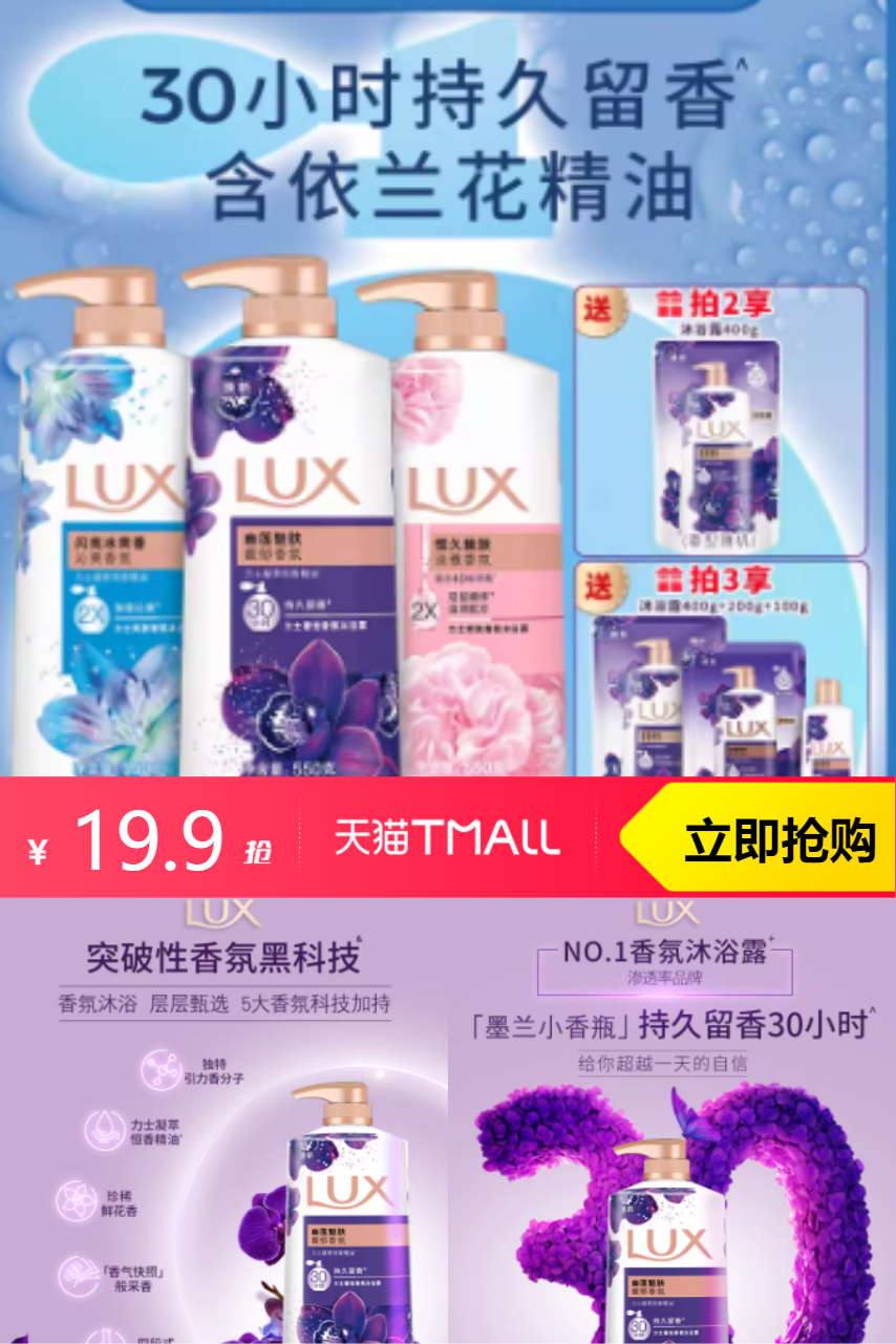 享受沐浴新风尚,力士精油香氛,舒适肌肤触感。依兰沐浴露,滋润又清爽!