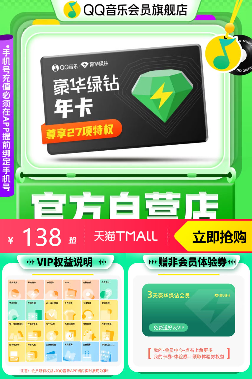 QQ音乐会员年卡豪华绿钻会员vip充值,歌曲畅听,尽享无限乐章,高质量音质,仿佛身临其境的听觉体验~