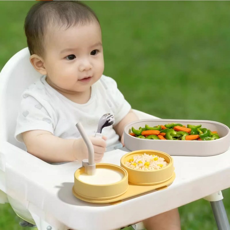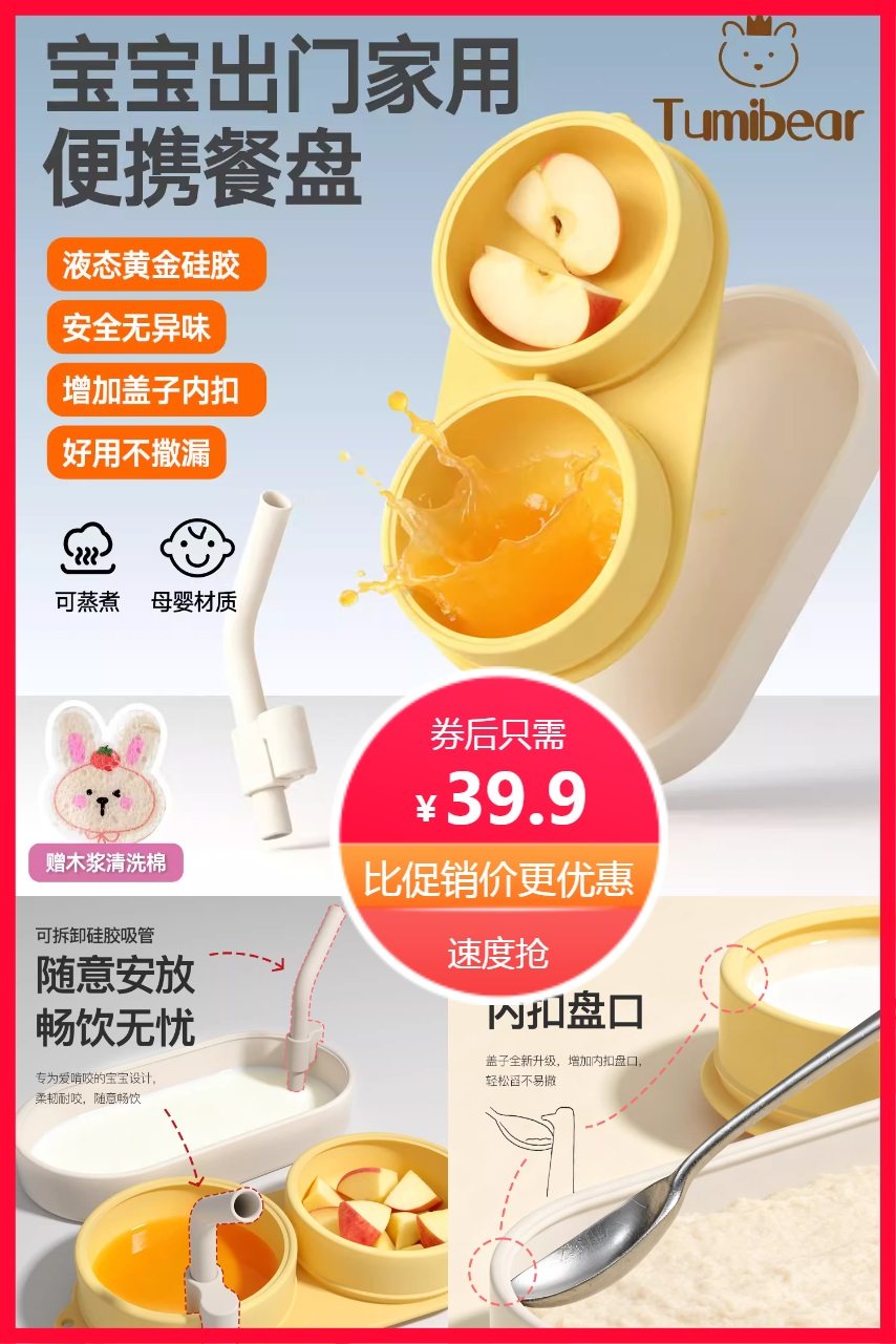 图米熊便携式双格餐盘,可冷冻,可加热!可拆卸硅胶吸管,可随意安装。户外聚餐皆宜!隔热硅胶,安全不烫手!双吸盘设计,不易打翻,方便宝宝独立用餐!