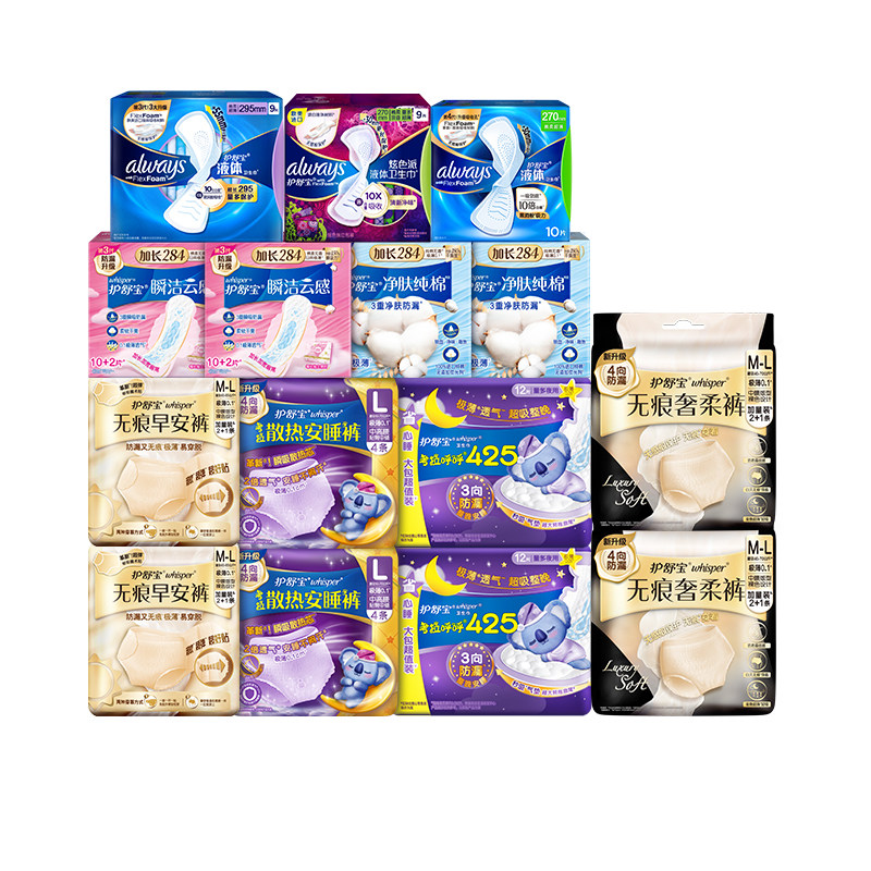 【任选3件直降43元,满99减5元,超级立减减18元,88vip专享95折减2.7元,到手价46.56元;叠加消费券满200减25元,到手价3件40.92元;再送2片液体卫生巾】经期囤货必选——护舒宝全套组合!液体卫生巾吸收快,不侧漏;安睡裤夜用安心,早安裤贴合舒适,全套任选3组~