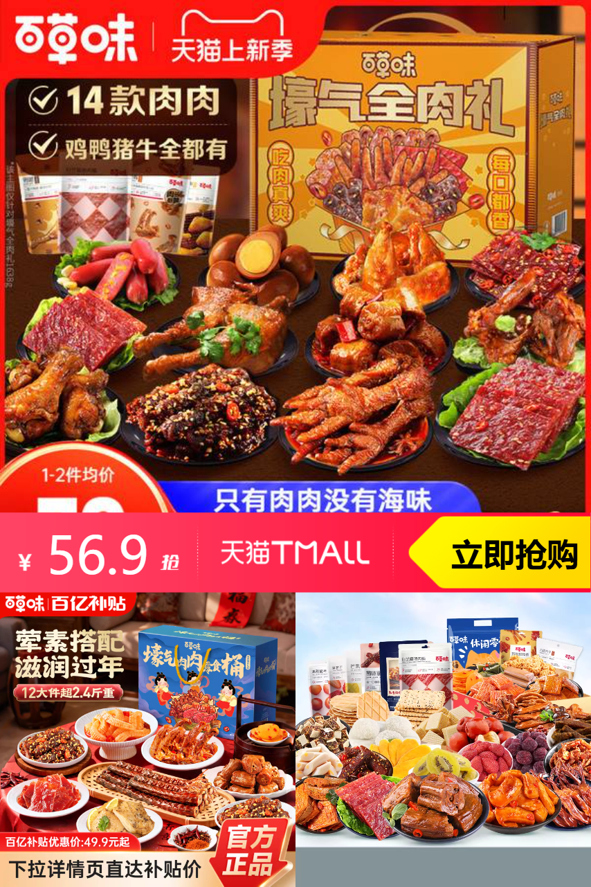 【店铺立减30元,88vip9.5折抵扣2.85元,淘金币6.46元,年货节消费券200-25抵扣5.9元,到手41.69】百草味零食大礼包肉礼盒1235g,品质优选~