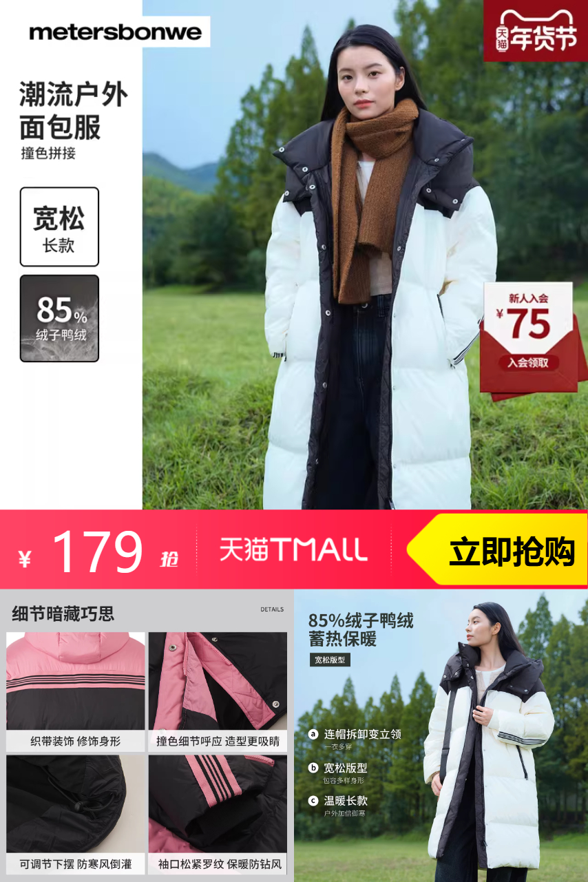 【立减131+服饰天降券40到手179+叠加消费券到手156.6元】美特斯邦威羽绒服女士秋冬新款拼接撞色加绒,品质优选~