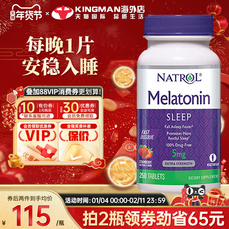 Natural sleep, restful night, Natrol褪黑素助眠5mg速溶天然褪黑素,帮助您享受一个美好的夜晚。每盒含有250粒,让您轻松获得高质量的睡眠。这款产品采用草莓口味,口感清新,适合各种口味的人群。无论您是成人还是儿童,都可以安心使用,您的健康与舒适。