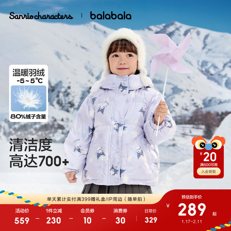 【库洛米IP】巴拉巴拉官方旗舰的甜美可爱三丽鸥联名羽绒服,为孩子们带来温暖与快乐。采用高品质材料制作,保暖又舒适,适合各种天气穿着。无论是在室内还是户外玩耍,都能让你的孩子感受到家的温馨和保护。这款冬季外套不仅适合女孩,也适合男孩,是每个孩子冬季衣柜里的必备单品。快来为你的宝贝挑选一件吧!