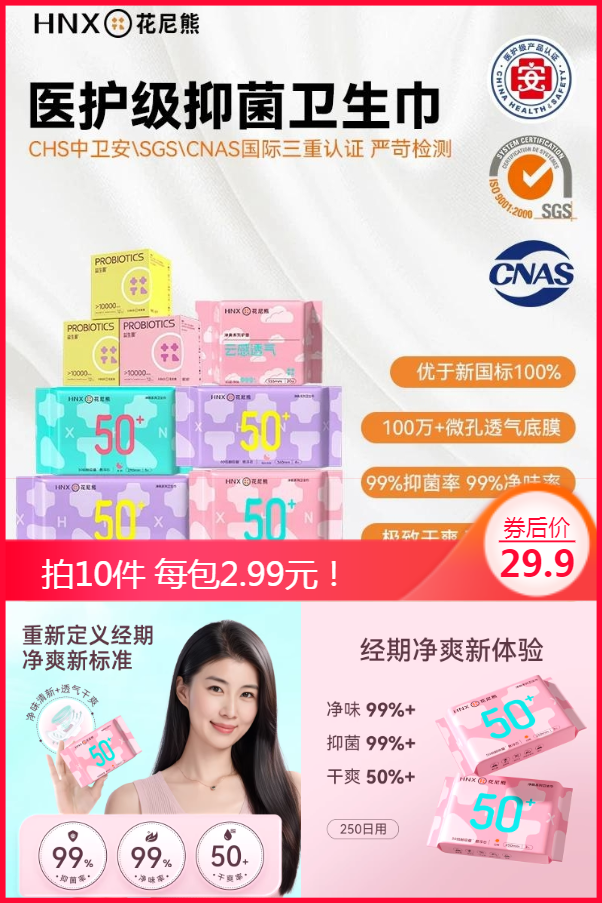 任选10件到手29.9元!每包仅需2.99元!花尼熊医护级抑菌卫生巾 99%抑菌率,99%净味率,100万+微孔透气底膜 极致干爽 双层防返渗 无荧光剂无甲醛无香精无绒毛浆 进口高分子吸水因子 三重防漏技术