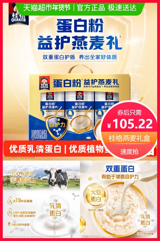 官方立减60元+券20元+红包立减3元+点击右上角三个点进入淘金币省3.78元+88vip省5.45元后约96.77元,蛋白粉,益护燕麦礼,双重蛋白护盾,养出全家好体质!