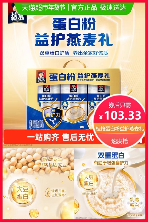官方立减60元+券20元+红包立减3元+点击右上角三个点进入淘金币省5.67元+88vip省5.45元后约94.88元,蛋白粉,益护燕麦礼,双重蛋白护盾,养出全家好体质!