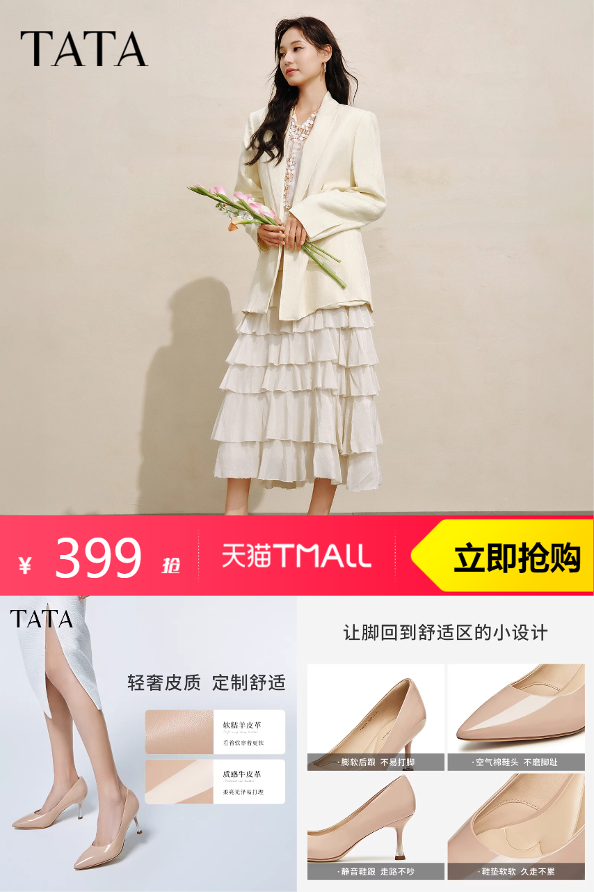 【叠加淘金币15元,凑消费券抵扣45元,到手339元】TATA他她女鞋2025新款尖头裸色高跟,根据亚洲女性脚型设计,鞋楦弧度更贴合足弓,久穿不易挤脚。