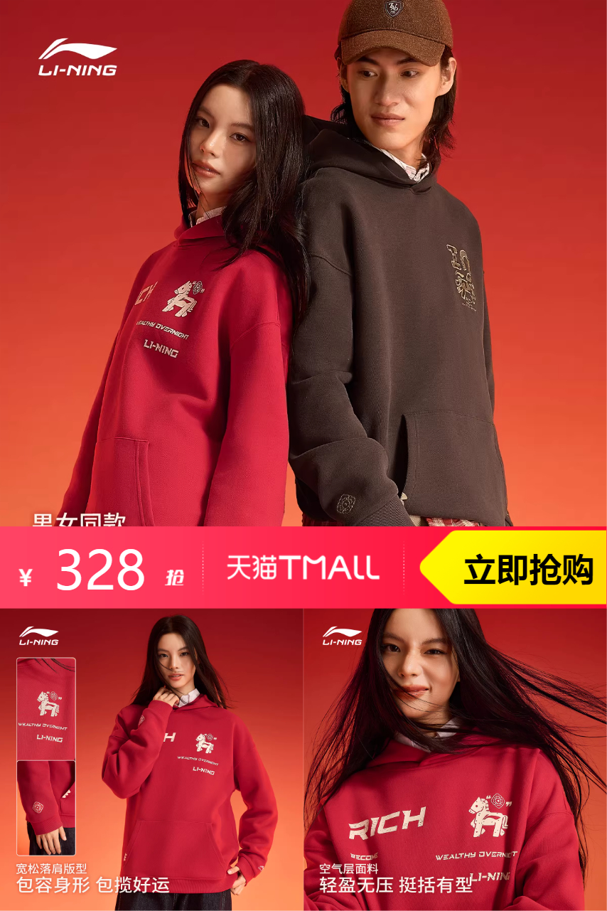 【淘金币抵扣9.84,消费券自动抵扣后到手243,可叠运动户外券】李宁马上有钱2026新款新年马年红色长袖,包容身形,包揽好运。