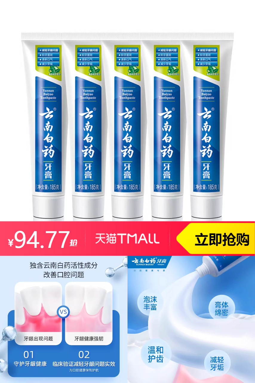 【百补叠加4.23金币到手94.77,凑消费劵到手83.39】云南白药牙膏,呵护您的口腔健康。经典薄荷香,唤醒您的每一天。科学配比,独特功效无与伦比。