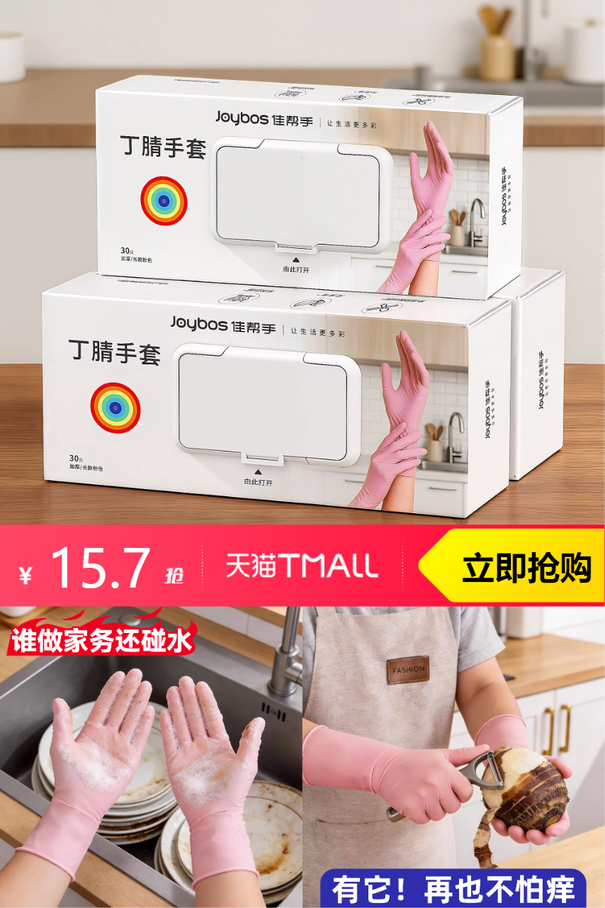 【淘金币抵扣0.62,年货节红包0.55 到手价14.53】佳帮手丁腈手套30只食品级家务,食品级抗菌材质,耐用贴合。