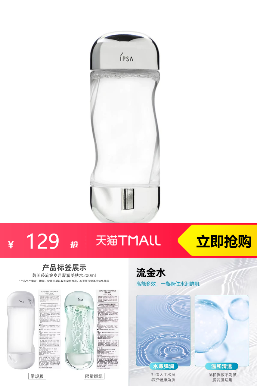 【原价189元-单品直降20元-官方立减40元-88vip抵扣6.45元-淘金币抵扣9.45元-红包限时补贴15元=到手98.1元】【下拉领淘金币】茵芙莎流金岁月美肤水,品质优选~