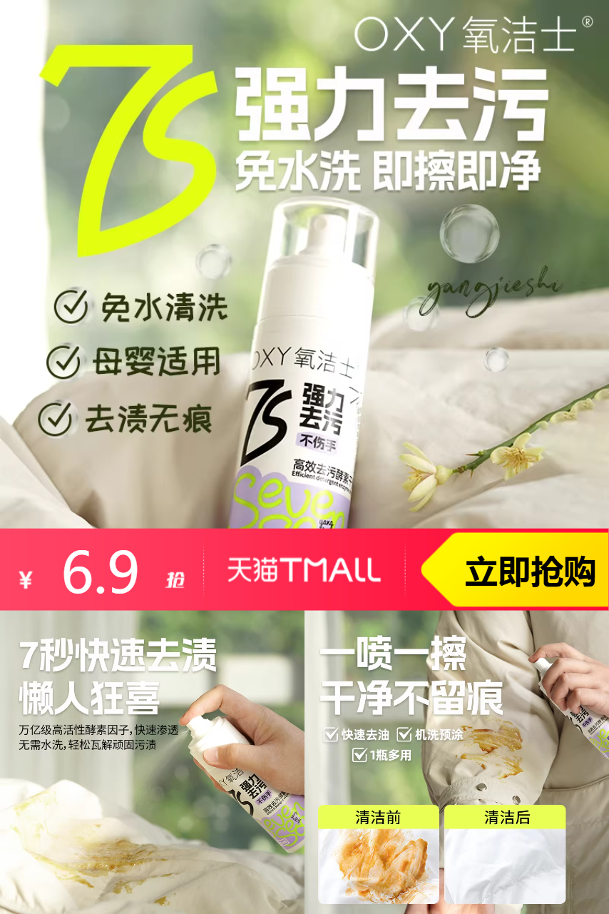 氧洁士免水洗去污干洗剂,7秒洁净!一喷一擦,油渍污渍全拜拜,温和不伤衣,安全0刺激,母婴、宠物接触无忧!便携小能手,随身带一支,突发污渍再也不慌!