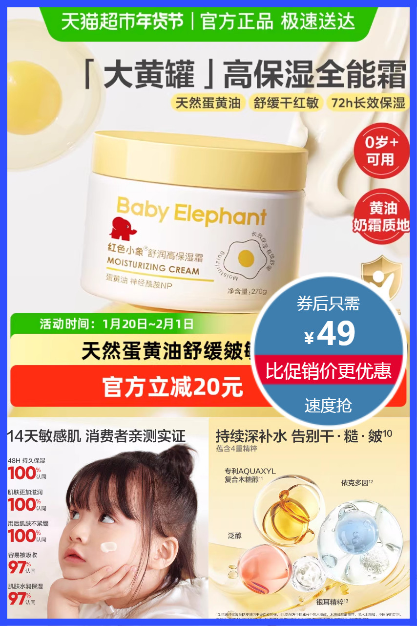 立减20元+88会员+淘金币,领200减25的劵凑单叠加劵36.3元!红色小象儿童面霜大黄罐全能霜270g,天然蛋黄油,舒缓干红敏,72h长效保湿,蕴含4重精粹,告别干、糙、皴,细腻柔软,易推开易吸收!