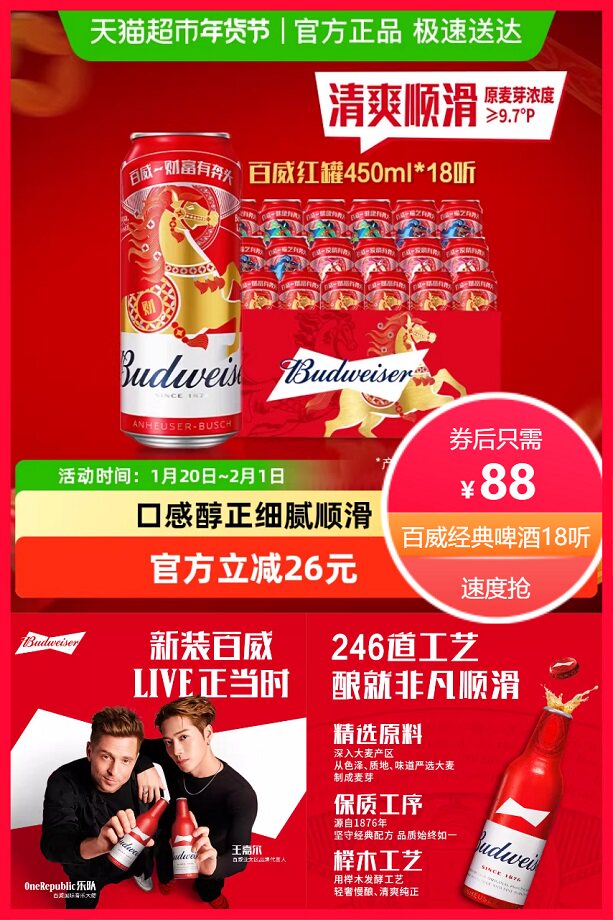 产品标题下方红色字体点进去领取65-8元惊喜红包+官方立减26元+券5元+88vip省4.4元后约75.6元,凑单消费券200-25后约66.1元,Budweiser/百威啤酒小麦醇正拉罐330ml*24听整箱礼盒装,精选优质原材料,拒绝附庸,率性随心。
