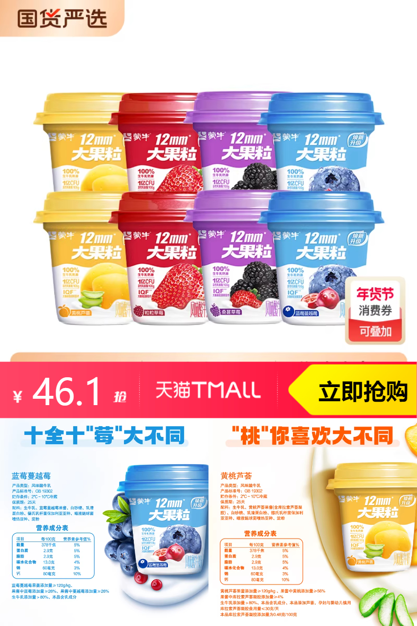 【叠加淘金币减7.38元,页面价82-官方立减9.9-淘金币7.38-淘客券26=38.72】蒙牛大果粒,美味又健康!天然生牛乳,品质保障,浓郁口感,不容错过。