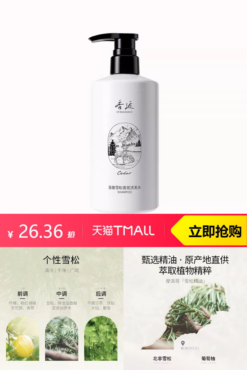 【官方立减4.4,满27减3,淘金币抵2.14,到手价26.36,赠3瓶小样。】香近洛基雪松香氛洗发水500ml,品质优选~