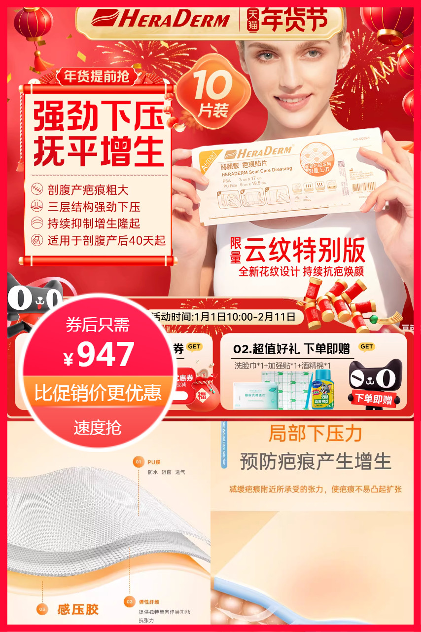 【可签到+官方立减143元+限时红包抵扣46元+消费券满480元券60元到手约752元+赠洗脸巾+加强贴+酒精棉】HERADERM疤痕贴,剖腹产妈妈必备,进口凝胶配方,贴合隐蔽更安心,温和修复不刺激,强劲下压,滋润锁水,防水透气,阻隔细菌,单向伸展抗张力,抚平疤痕,促进愈合,预防增生,全新花纹设计,持续抗疤焕颜,速抢