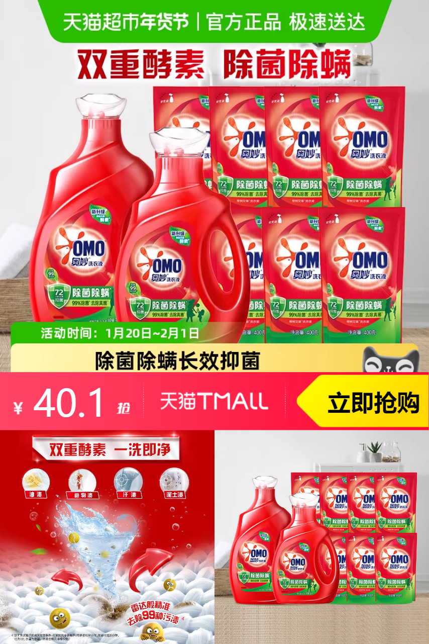 【叠加88立减2.4+淘金币5.5到手40.1】洁净新选择,奥妙洗衣液,除菌除螨,轻松洗护,酵素技术,更高效。
