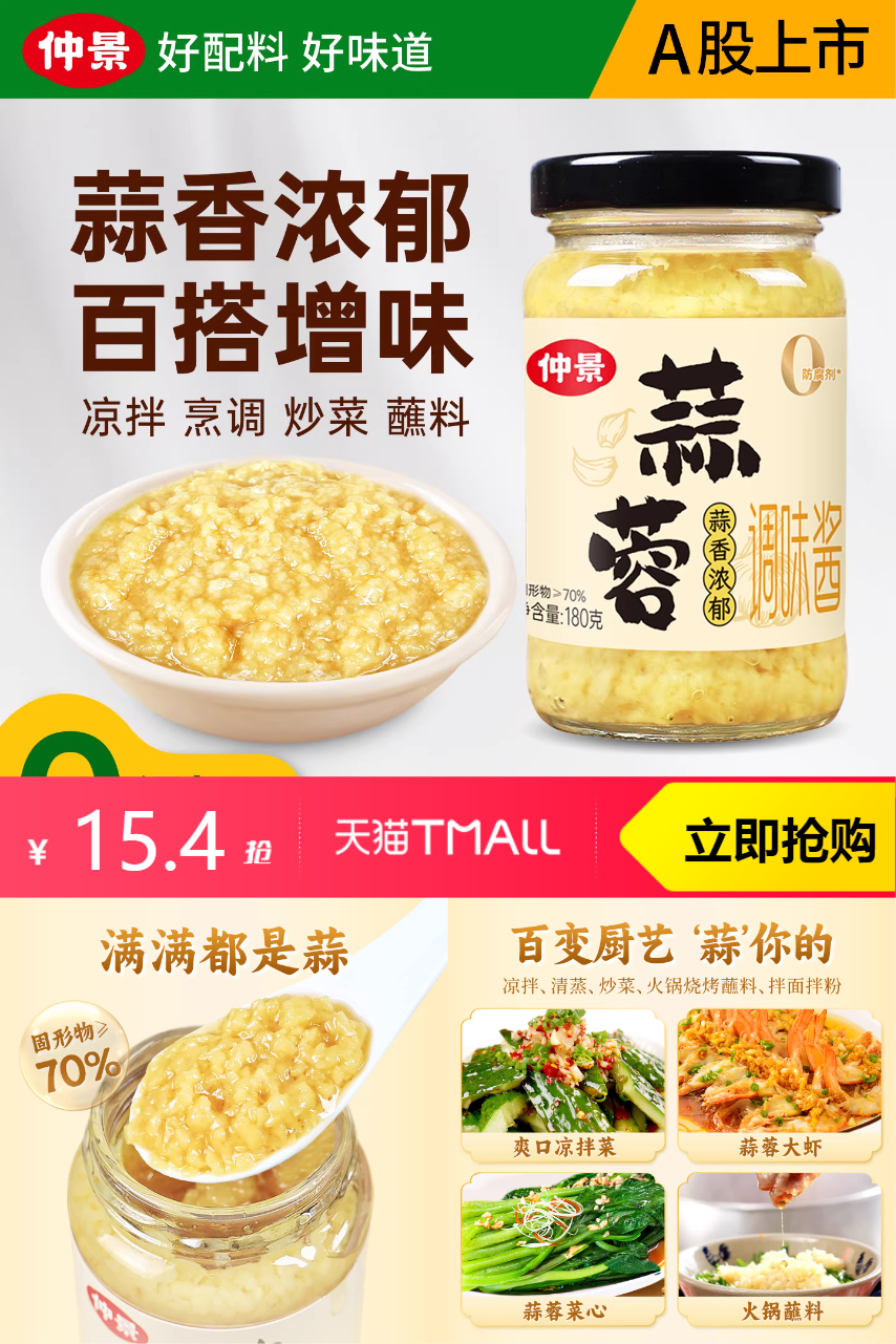 【淘金币可抵0.51,可叠消费卷88vip,极至到手13.02】仲景蒜蓉酱180gx2瓶!!色香味美,百搭增味。