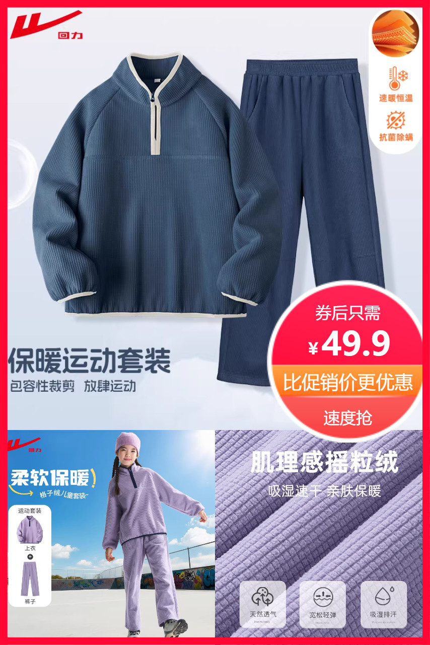 送运费险!回力新款冬季加绒卫衣运动套装,面料柔软,版型舒适,抗起球,有防风领口,无荧光剂,百搭不挑人,内里肌理感摇粒绒,吸湿速干,亲肤保暖!120-160cm可穿