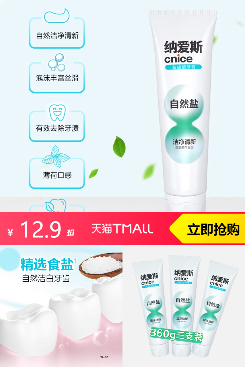 【88vip减0.65元,淘金币抵扣3.69元,淘礼金补贴0.9元,返1元猫超红包,到手6.62元。】【下拉享金币】纳爱斯牙膏120g*3,清新口气,自信笑对每一天!它的独特香味,让你一整天都拥有清新的口气,无论何时何地,都能自信地与人交流