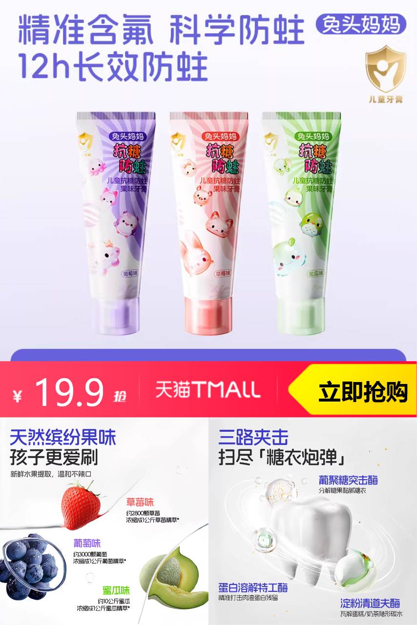 【淘金币可抵0.6,可叠消费卷】兔头妈妈儿童抗糖牙膏40g,三重抗糖酶+精准含氟,12小时防蛀,果味清新不刺激,宝宝爱刷牙!适合爱吃甜食的小朋友!