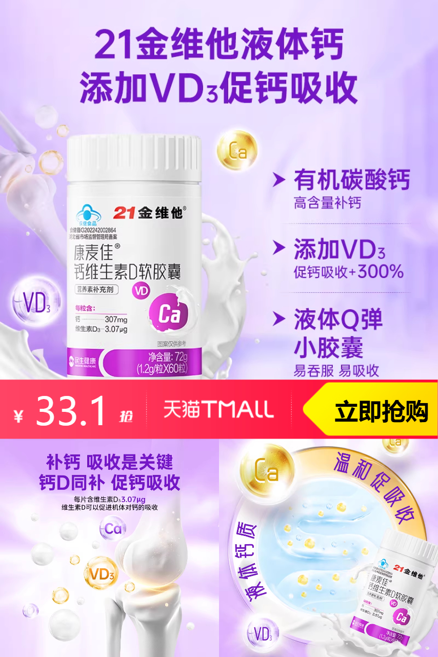 【满减8.45,淘金币抵0.65,88会员9.5折减1.69,叠加满200减25分摊消费券减3.75,到手27.66】【2瓶】21金维他液体钙维生素d3钙片,维生素加持:除了钙,还有多种维生素助你全面补充营养。