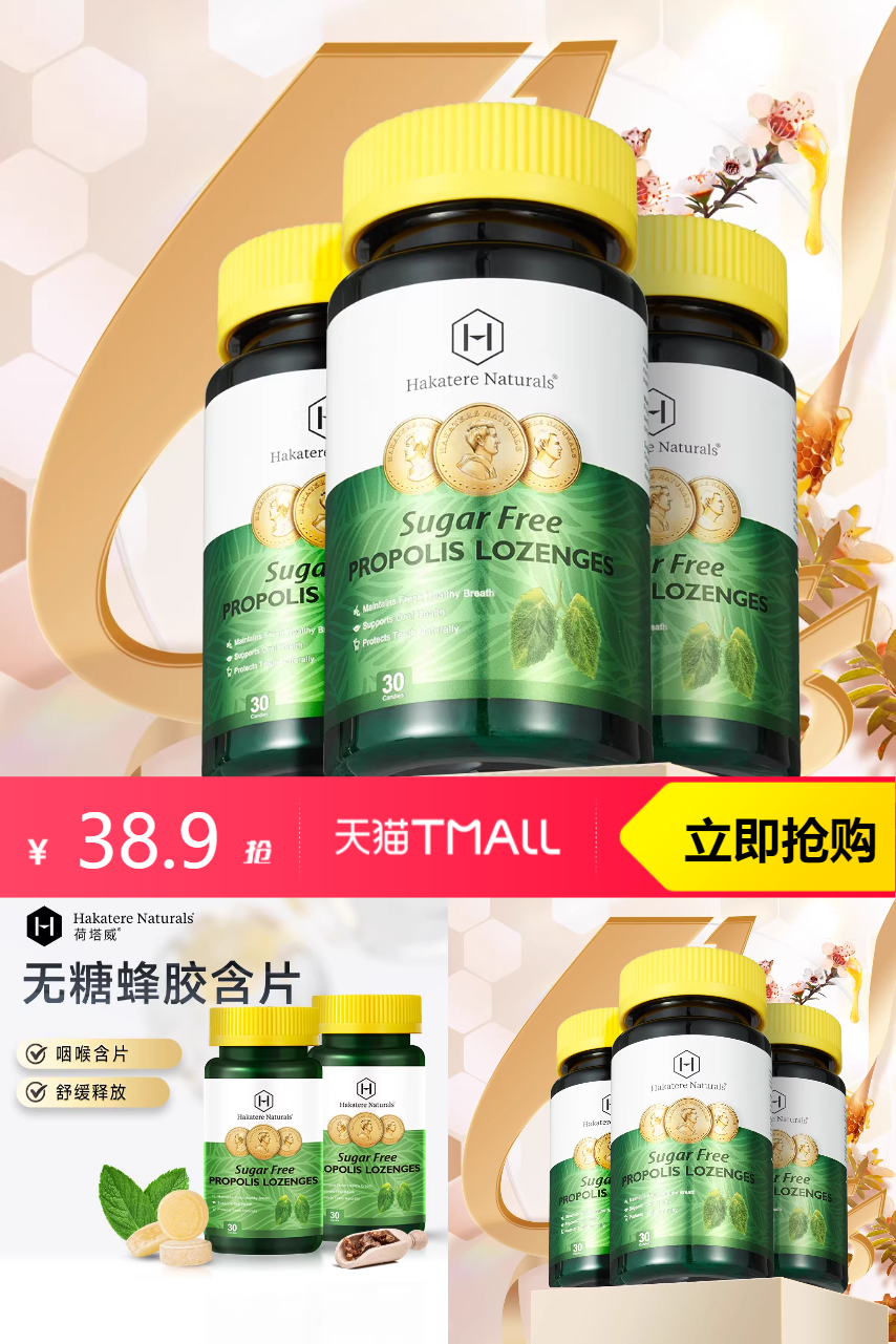 【淘金币1.34,到手价37.56】荷塔威无糖蜂胶糖,纯天然味道佳,独立包装,携带方便。