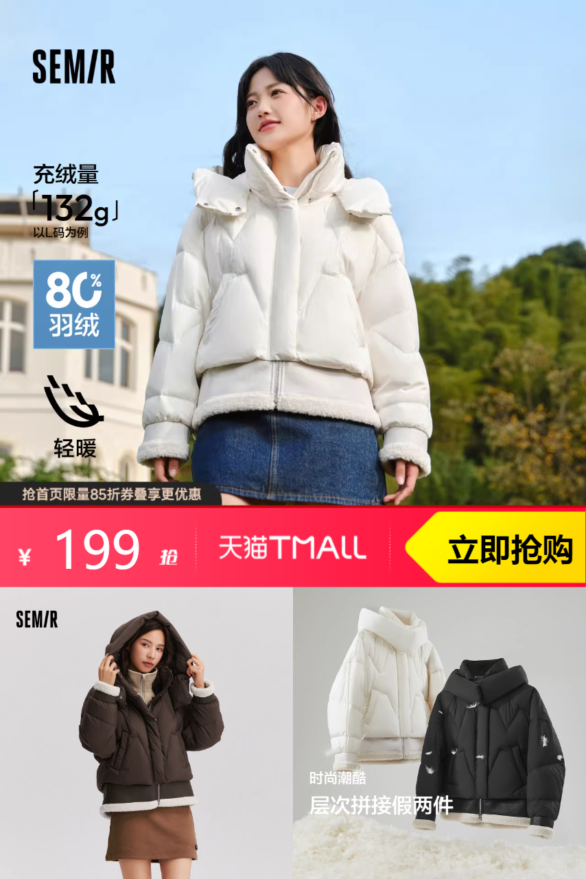 【淘金币2块 消费券抵扣 24 淘礼金抵扣39.2 最终到手 131.8】森马羽绒服,女款设计感十足!拼接假两件,时尚不撞衫。连帽保暖,温暖你的冬季。独特设计,引领潮流风尚。