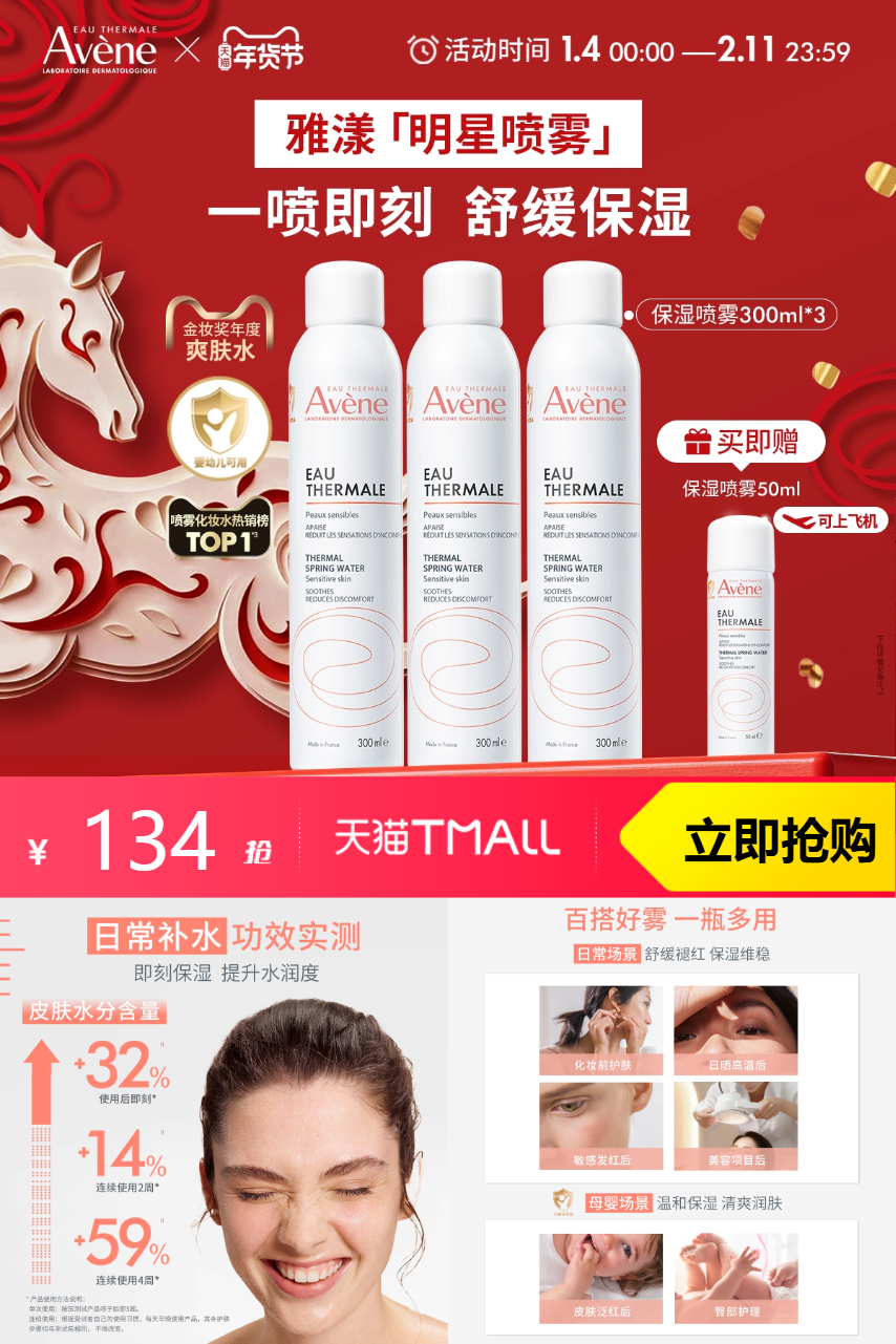【赠保湿喷雾50ml;下单立减21元,消费券满200减25元抵扣16.75元,到手117.25元】雅漾舒泉保湿喷雾300ml*2瓶,品质优选~