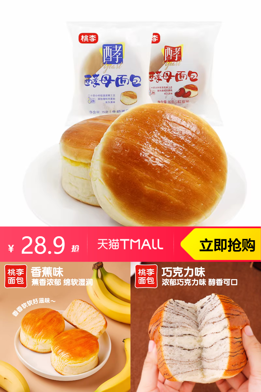 【官方限时补贴直降11元,淘金币3.58元,猫超价到礼金1.15元,88vip抵扣1.45元,到手22.72元】桃李大牌,天然酵母面包!上班族,上学党都在囤的,现做现发~45天保质期,新鲜绵软好吃!多口味可选,速囤!