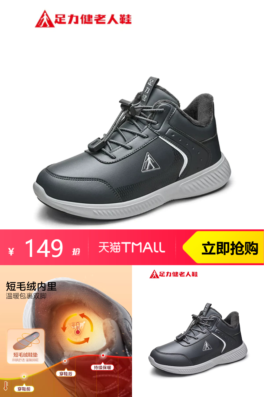 【原价239元-限时立减45-店铺满329减21元-官方立减29-红包抵扣29.8-淘金币抵扣4-年货节消费券凑单抵扣17.44元=到手92.76元】足力健加绒棉鞋,柔软皮面+加绒内里,保暖舒适;高帮护踝设计,稳重安全。专为老人脚型打造,软底缓震,行走轻便。经典款式,孝心送礼自用都合适!