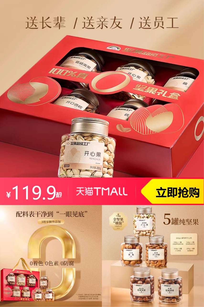 【百补119.9,百补金刚券减11.99,淘金币抵扣2.39,消费券减13.19,到手92.33】天虹牌坚果礼盒,开心果商务体面送礼,超级多的坚果,超级好吃!!