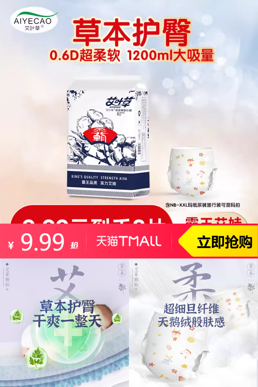 【淘金币减2.68,红包减1.31,到手6元,单片0.75】艾叶草婴儿纸尿裤试用装8片便携旅行装,品质优选~