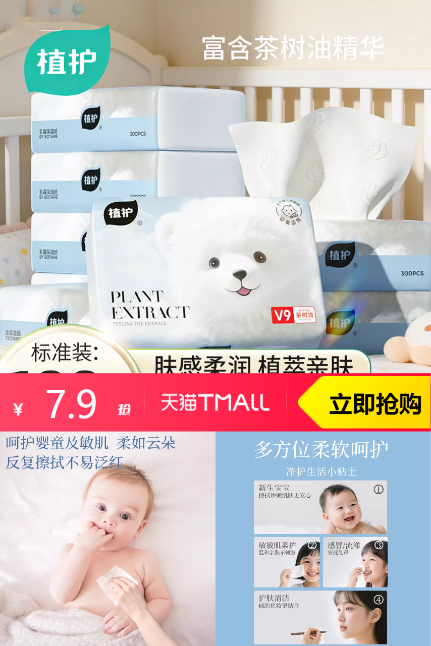 【原价12.4,领券减2,超级立减2.5,淘金币抵扣0.61,到手仅需7.29,凑单到手6.37】天然茶树精华,母婴适用,添加保湿乳霜,柔润亲肤加倍!反复擦拭不易泛红!!给宝宝用都很好!
