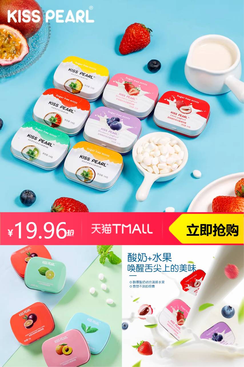 【淘金币可抵扣0.46,到手价19.5】kisspearl无糖水果味薄荷糖,清爽果香提神醒脑,小铁盒便携设计,随身携带超方便,健康无糖,口气清新一整天!