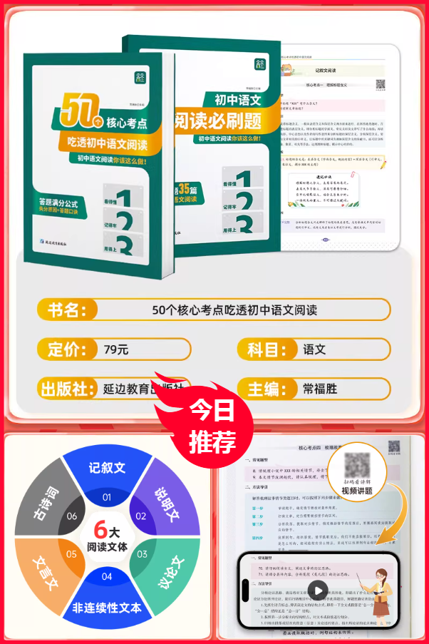 初中阅读理解提分秘籍,阅读有方法 答题有公式。50个核心考点,35篇经典真题,120个答题模板,50个速记口诀。让你答题有方向、有技巧,提炼要点,总结失分点,实战实训,轻松提分。