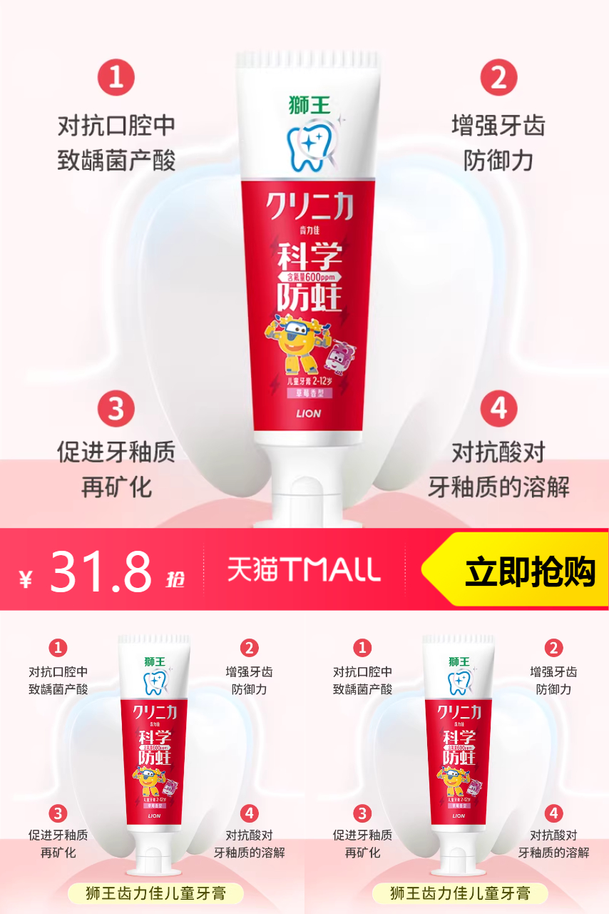 【防蛀牙膏果味50g*3软毛细毛牙刷3支6-12岁;官方立减12元,88vip9.5折抵扣1.59元,淘金币抵扣1.59元,到手28.62元】狮王齿力佳儿童牙膏50g*3软毛牙刷3支,品质优选,儿童牙膏。